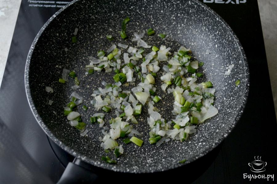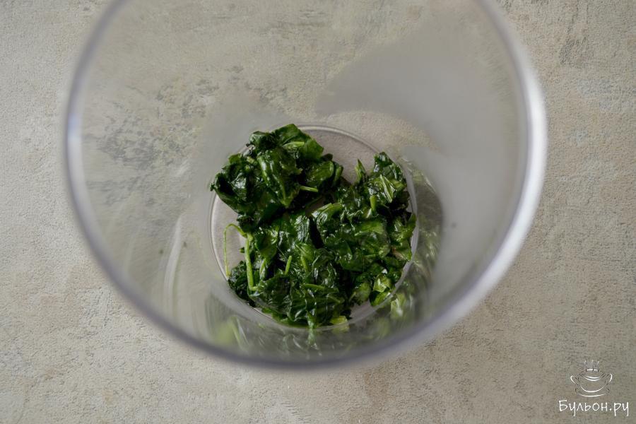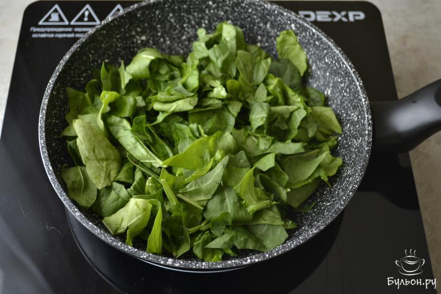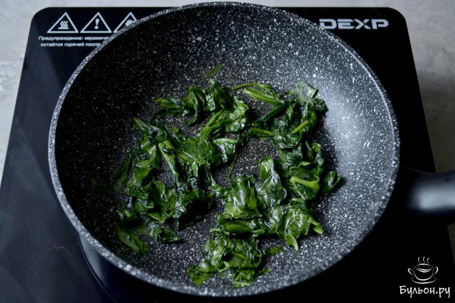 3. Помешивая, прогрейте шпинат на сковороде, всего 3-4 минуты, на среднем огне. Шпинат очень уменьшится в объеме.