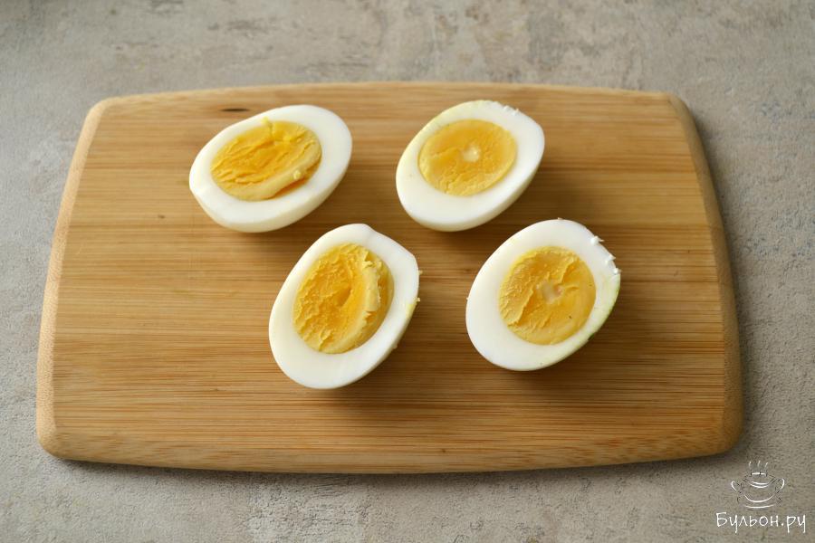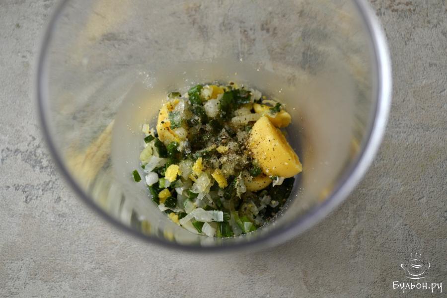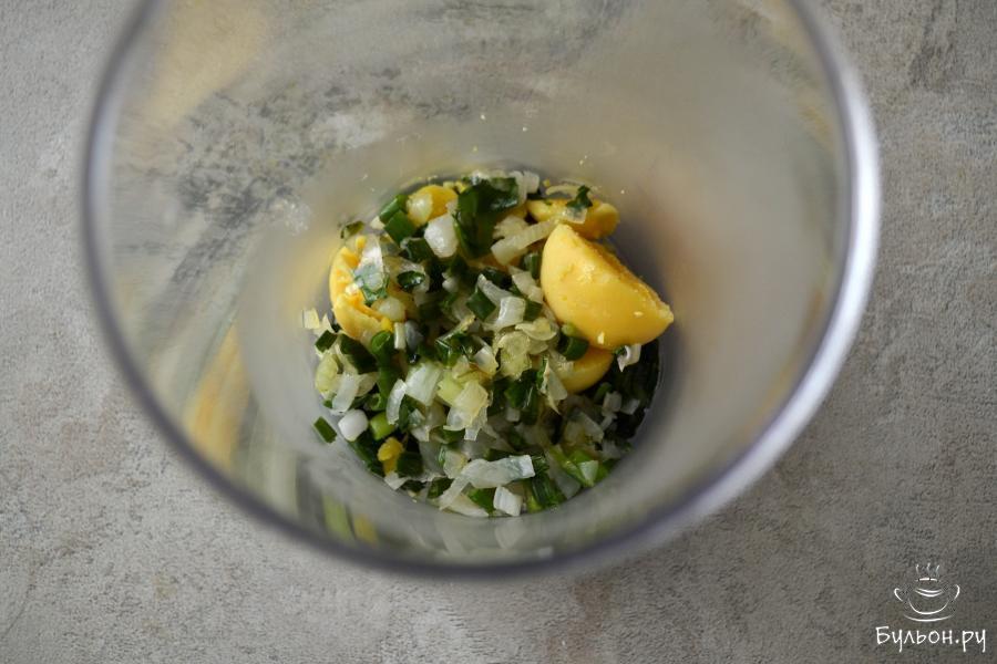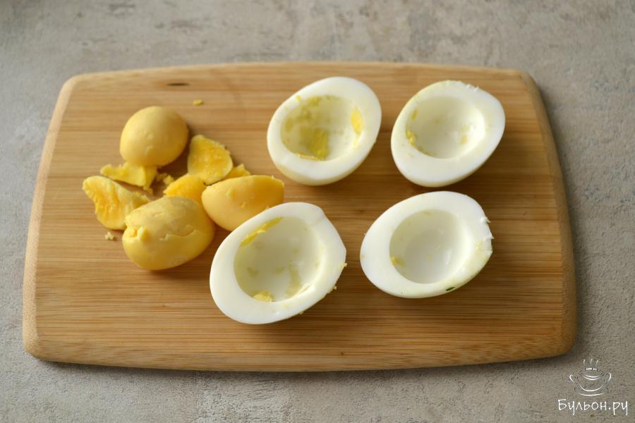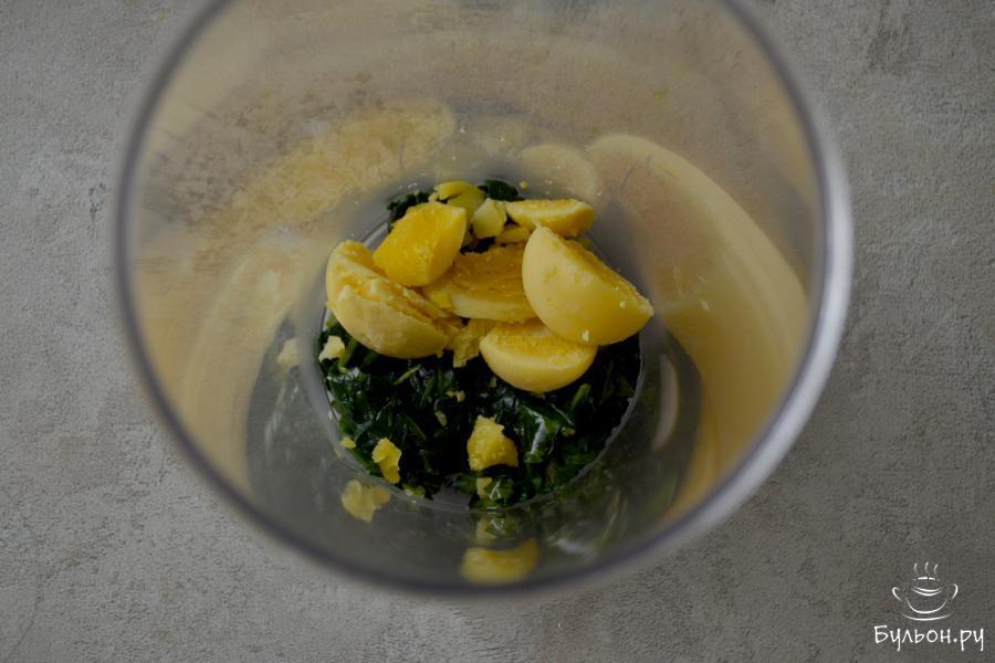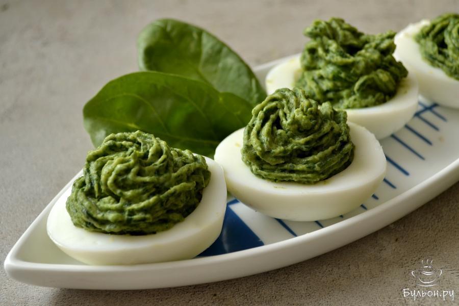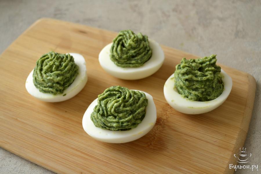 13. Половинки белков заполните приготовленным яично-шпинатным паштетом, при помощи кондитерского шприца или просто маленькой ложечкой.