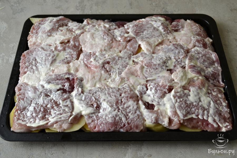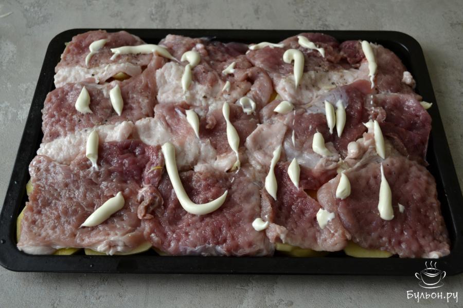 9. Ложкой размажьте майонез по всему мясу тонким слоем и поставьте противень в духовку, заранее разогретую до 180 градусов.