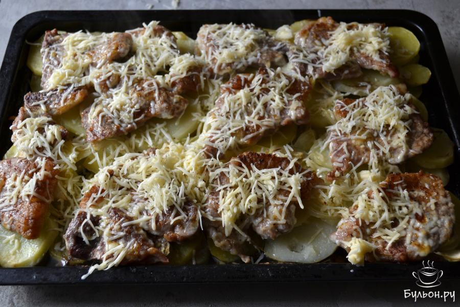 11. Когда мясо будет готово, достаньте противень из духовки и посыпьте мясо натертым сыром. Верните противень в духовку на несколько минут, чтобы сыр расплавился.