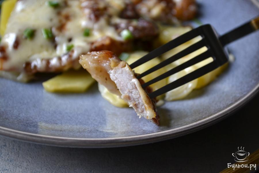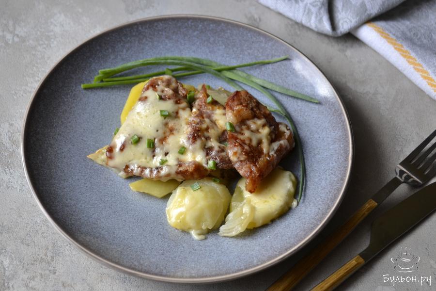 Мясо с картошкой, запеченное в духовке, под сырной корочкой, - это блюдо, которое можно с успехом приготовить для праздничного стола. Оно получается очень сытное, вкусное, ароматное. Обычно, для запекания, используется свинина, но и из молодой говядины блюдо получится не менее вкусное. А мясо, запеченное с картофелем, позволяет получить сразу, и мясо, и гарнир. Запеченная картошка получается очень сочной за счет мяса, сырная корочка придает блюду особенный нежный сливочный вкус. Попробуйте приготовить!