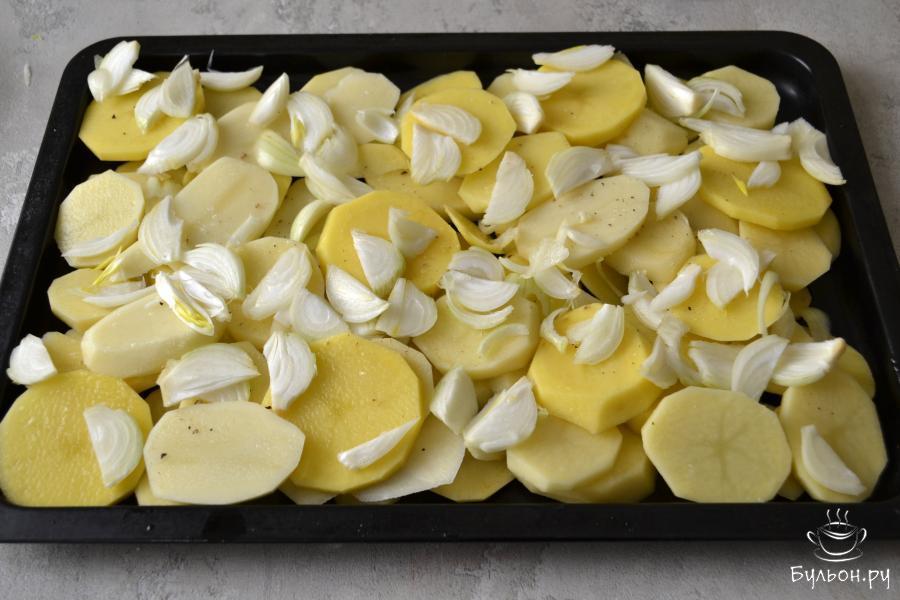 6. Картофель вымойте и очистите от кожуры. Нарежьте кружочками, толщиной 2-3 мм. Смажьте противень или форму для запекания растительным маслом и положите картофель. Посолите, посыпьте черным молотым перцем и нарезанным репчатым луком.