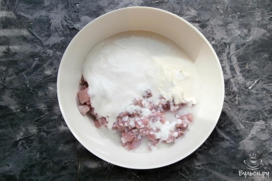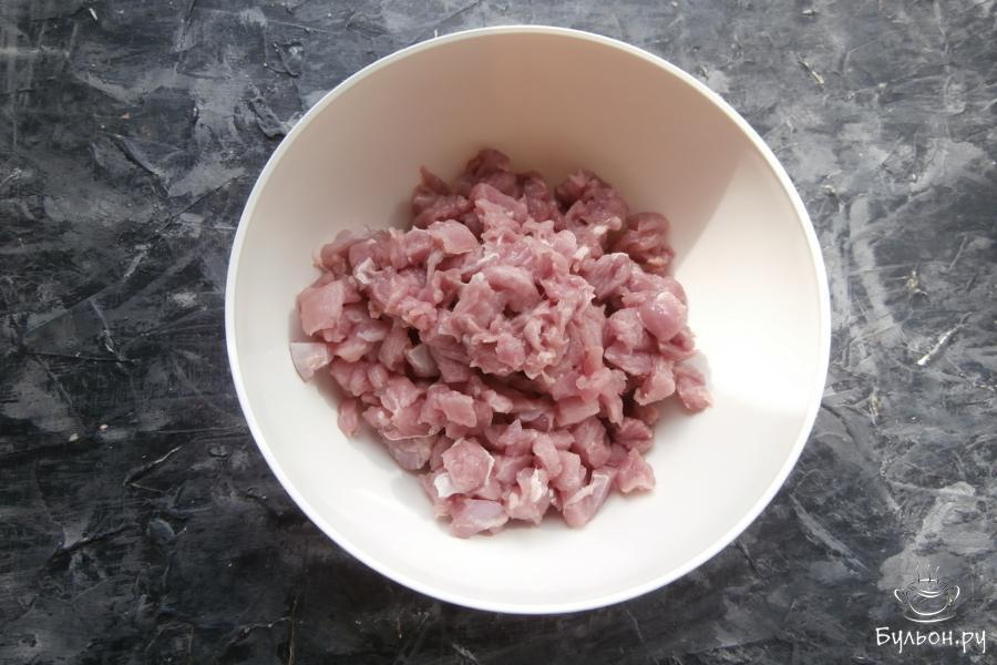 2. Обрезать со стейка все мясо, удаляя прожилки и кости. Мясо мелко порубить или порезать на маленькие кусочки острым ножом.