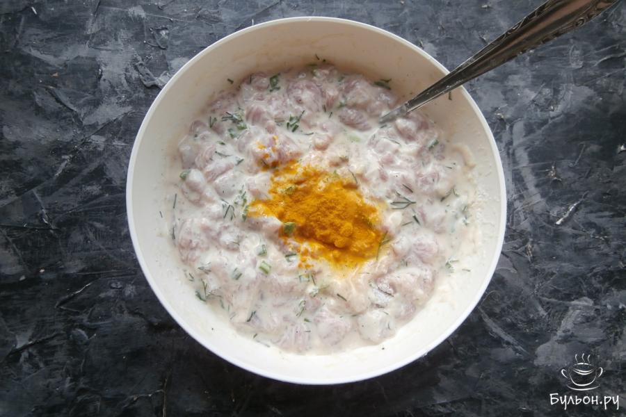 6. Всыпать куркуму и снова все тщательно перемешать. Отправить подготовленный фарш в холодильник минимум на 1,5 часа, можно оставить и на 2-4 часа.