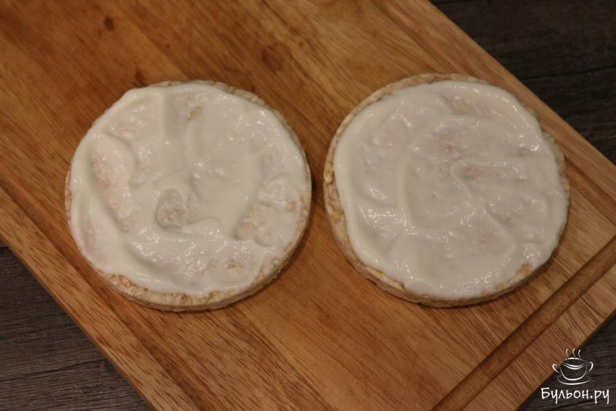 3. На каждый рисовый хлебец, положим по чайной ложке натурального йогурта и равномерно распределим его по всему периметру хлебцев.