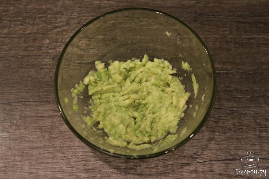 4. Авокадо разрежем пополам, удалим косточку, чайной ложкой извлечем мякоть авокадо и переложим ее в отдельную емкость. С помощью вилки разомнем мякоть авокадо.