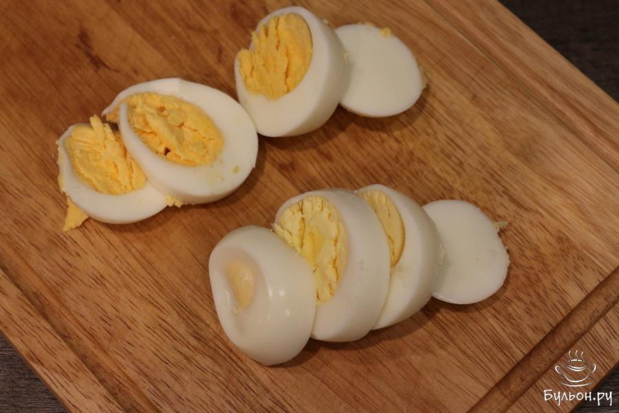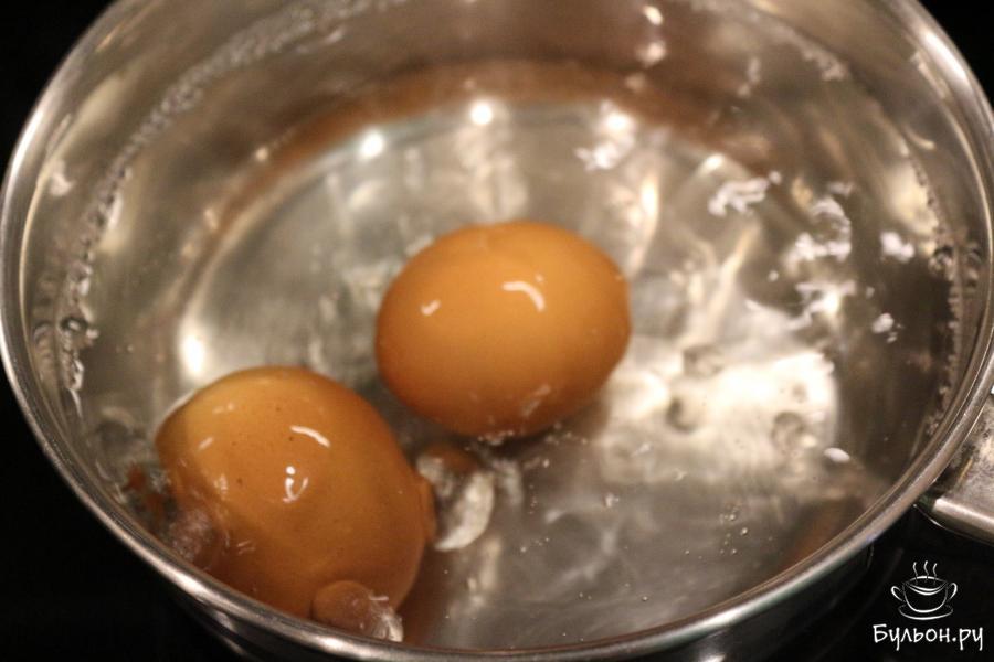 2. Отварим яйца вкрутую. Для этого, воду доведем до кипения и будем варить яйца еще 12 минут. После чего отправим яйца под проточную холодную воду, чтобы потом их было легче очистить.