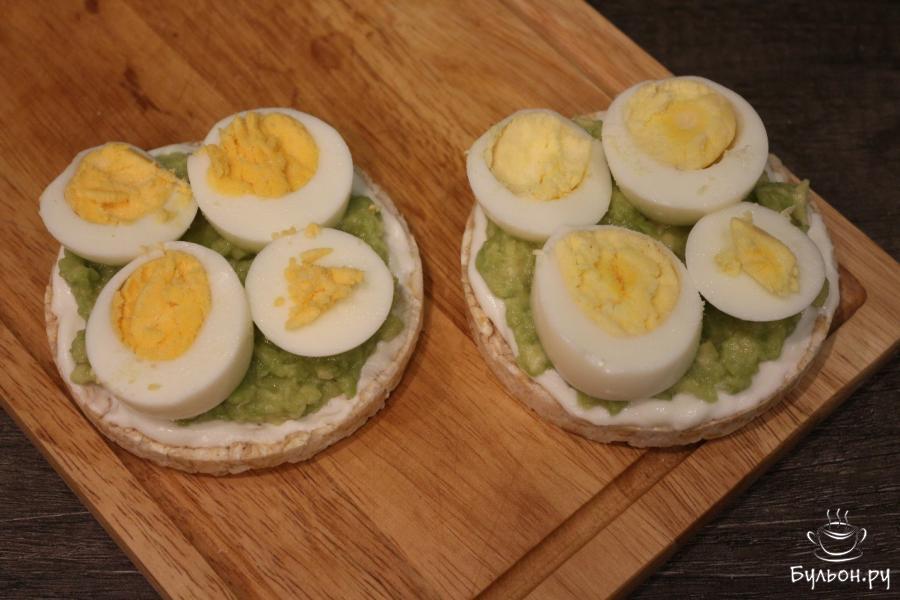 7. Кусочки одного яйца выкладываем на один бутерброд, кусочки второго яйца кладем на второй бутерброд. Сверху яйца также подсаливаем. Рисовые хлебцы с авокадо и яйцом готовы.