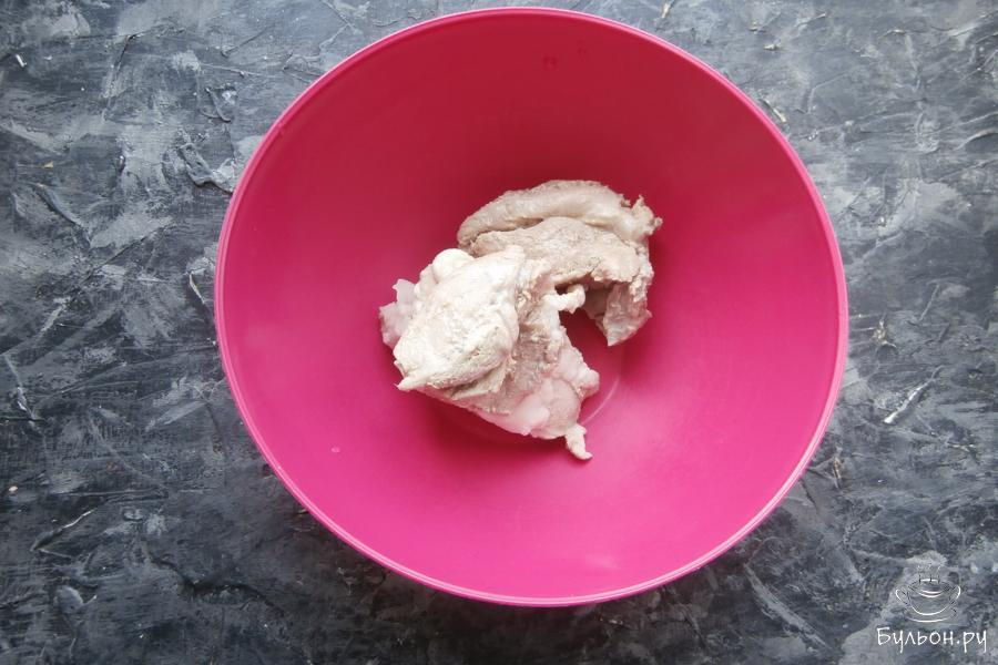 1. 300 г мякоти свинины отварить до готовности (минут 40) в кипящей, по вкусу подсоленной воде. Остудить его и если есть жир - удалить.