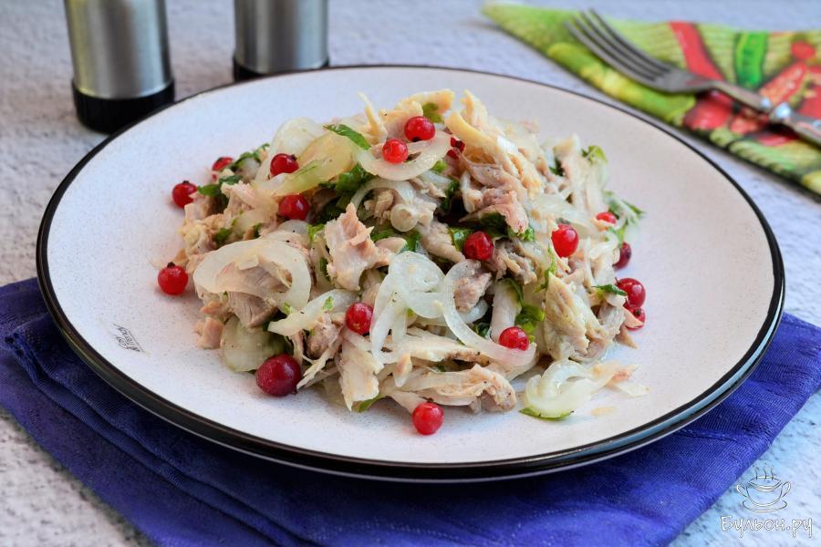 Рецепт этого салата я когда-то нашла в интернете и поделилась им одна женщина, которая была на деревенской свадьбе. Там она попробовала очень вкусный и простой салат, у которого не было названия, поэтому она назвала его просто "деревенский свадебный салат". Действительно, салат готовится всего из двух основных ингредиентов, а получается необычайно вкусным, напоминающим шашлык. Попробуйте, уверена, вам салат точно понравится. Вместо ягод красной смородины можно использовать зерна граната.