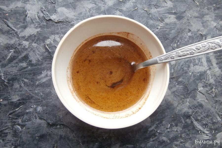 4. Приготовить маринад для салата: смешать 50 мл обычной воды с 5 ст. ложками уксуса, добавить 1,5 ч. ложки крупной соли, 3 ст. ложки сахарного песка, по 1/4 ч. ложки молотого черного и молотого чили перца, влить 3 ст. ложки растительного масла. Хорошенько все смешать.