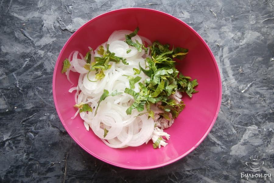 3. Добавить к мясу 2 шт порезанного тонкими колечками репчатого лука и 2-3 ст. ложки измельченной зеленой петрушки.