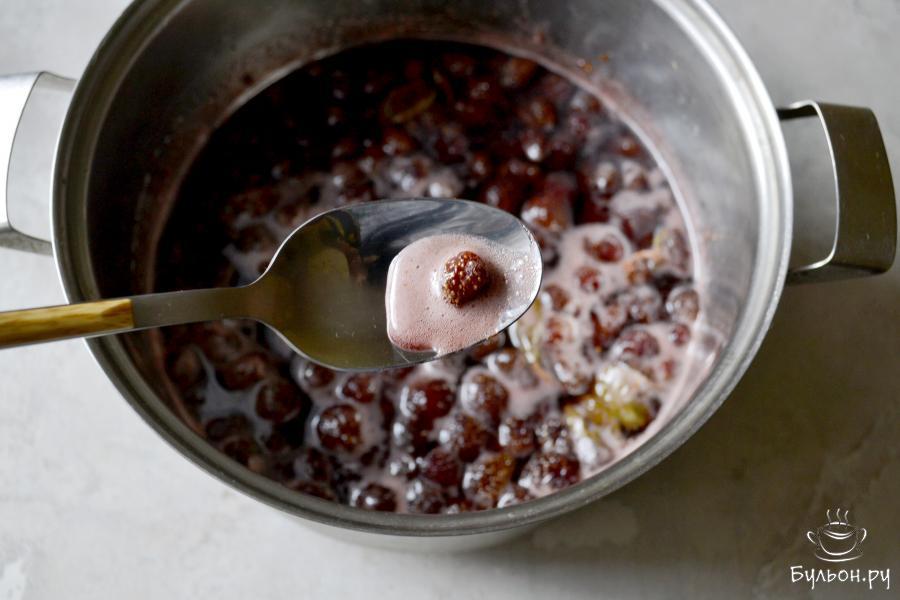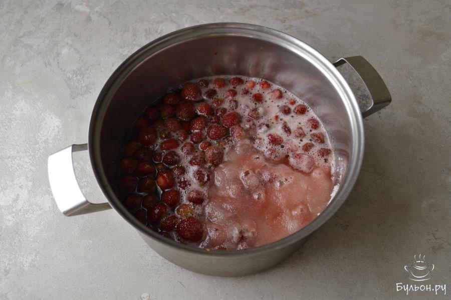4. На слабом огне доведите ягоды до кипения. Проварите 5-6 минут и отключите огонь. Снимите пенку, которая будет образовываться во время варки. Оставьте до полного остывания.