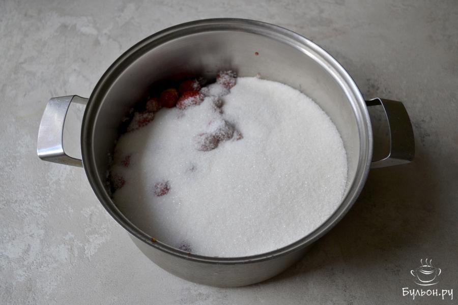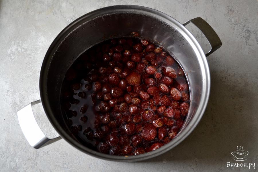 2. Переложите клубнику в кастрюлю и засыпьте сахаром. Оставьте на несколько часов, чтобы ягоды дали сок.