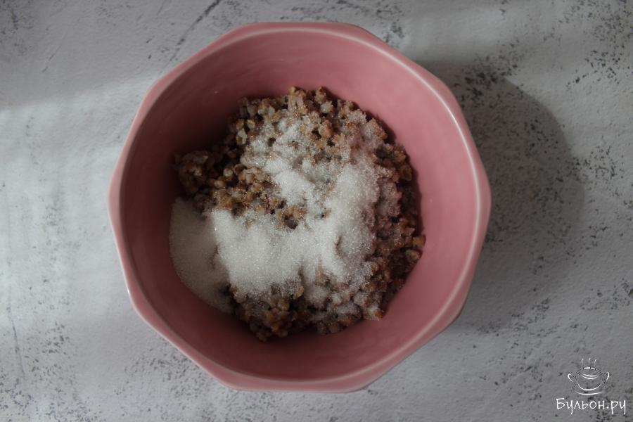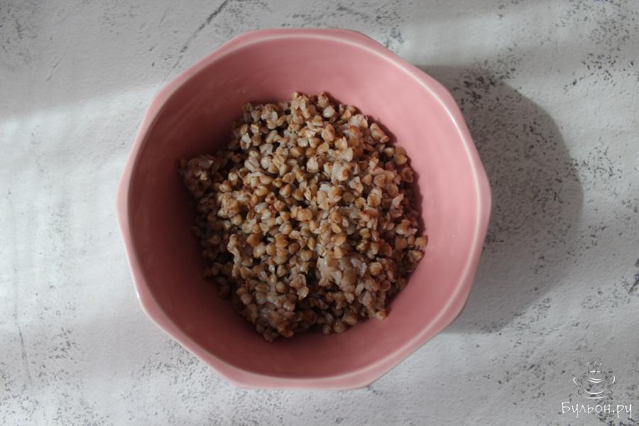 3. В порционную тарелку выложить, примерно, 150 гр. отварной рассыпчатой гречки. Размять комочки ложкой, гречка должна очень легко рассыпаться на крупинки.