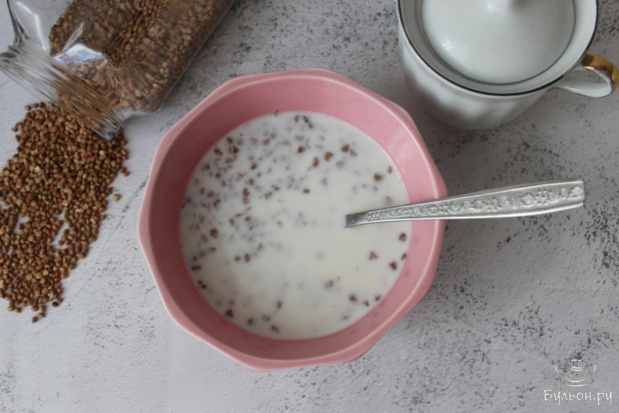 5. И залить 200 мл. холодного молока. Тщательно все перемешать, чтобы сахар полностью растворился в молоке и сразу же подать к столу. Также, порционно, разложить оставшуюся кашу.