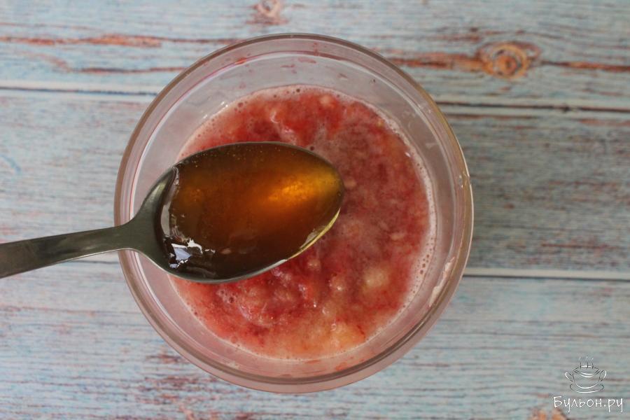 5. Добавляем в ягодно-фруктовое пюре мед. Для этого мороженого отлично подходит ароматный цветочный мед. Перемешиваем и пробуем на вкус, если нужно добавляем еще мед.