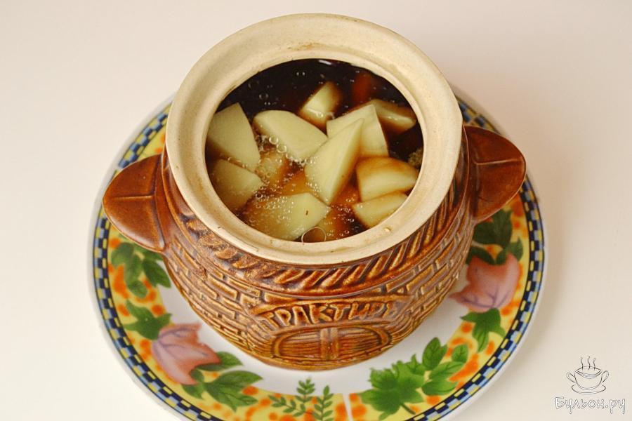 8. Далее очередь картошки. Картошку нарезать кусочками и разложить по горшочкам - примерно по 2 картофелины на один горшочек. В каждый горшочек добавить грибной бульон, соль и перец по вкусу. Закрыть крышками и поставить в духовку. Время готовки - примерно 1.20.