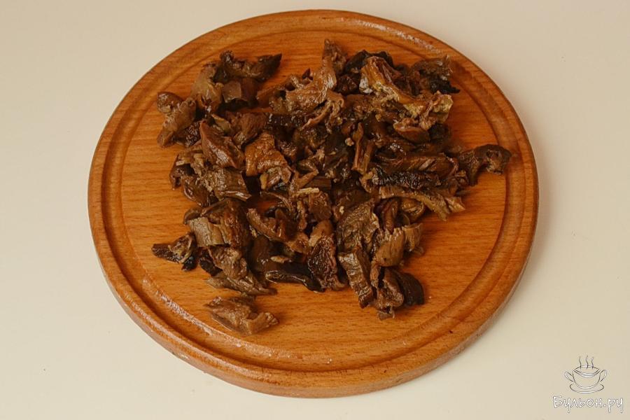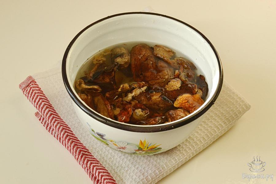 1. Грибы сушеные замочить часа на два в холодной воде. После этого грибы хорошо промыть, несколько раз меняя воду. Поставить вариться в одном литре воды, подсолив.