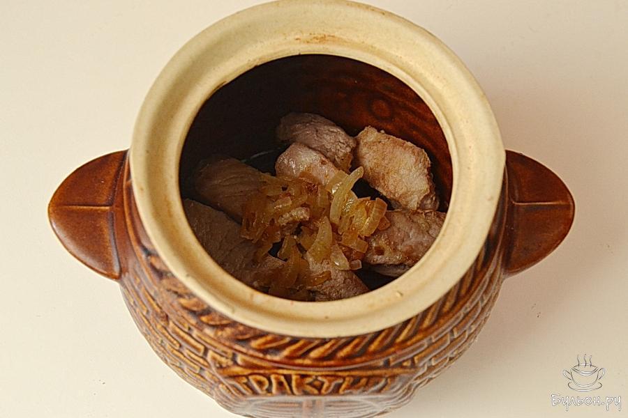 6. Отваренные грибочки еще раз промыть и нарезать. Бульон от грибов процедить и использовать для наполнения горшочков.
