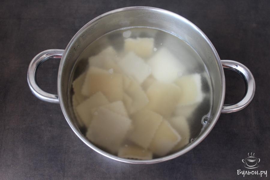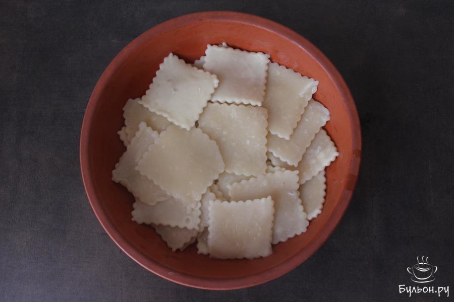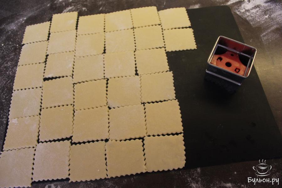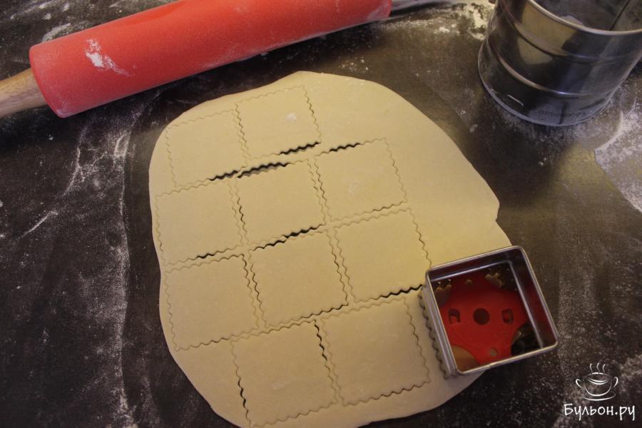 6. Возьмем кусочек теста (остальное оставим в пакете, чтобы не обветривалось), раскатаем и вырежим из него сочни. Можно просто использовать для этого нож, нарезав тесто на квадраты или ромбы.