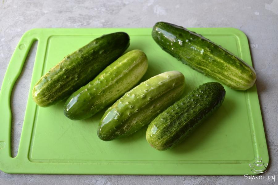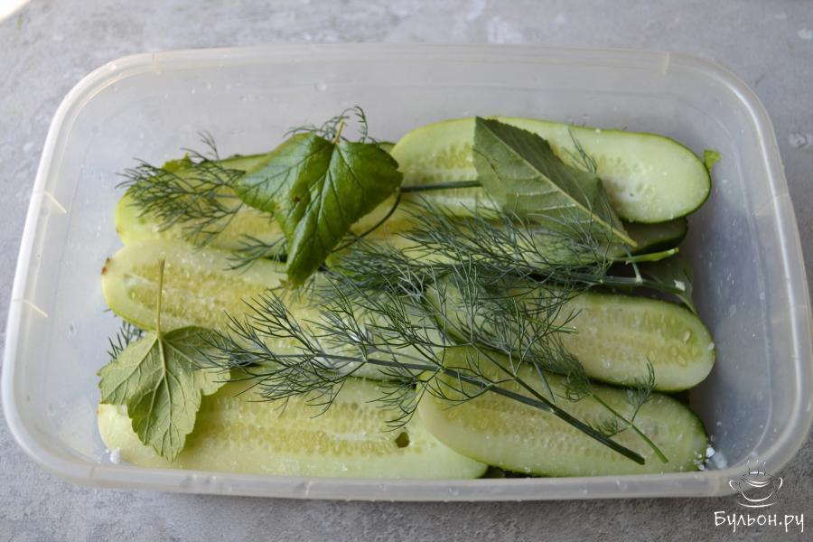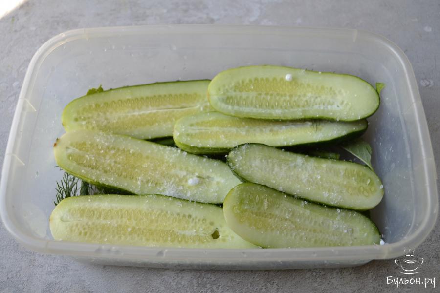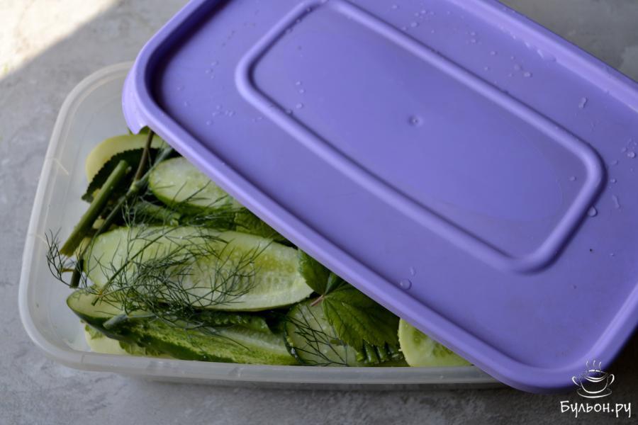 8. Закройте контейнер крышкой, встряхните его несколько раз и поставьте в холодильник. Примерно через полчаса-час еще раз встряхните контейнер, чтобы огурцы быстрее и равномернее пропитались солью.