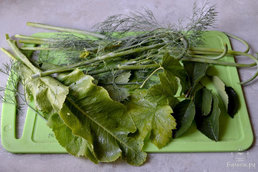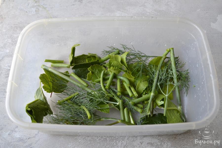 2. Для такого быстрого посола удобно использовать пластиковый контейнер с крышкой. Зелень крупно нарежьте и положите примерно 1/3 часть на дно контейнера.