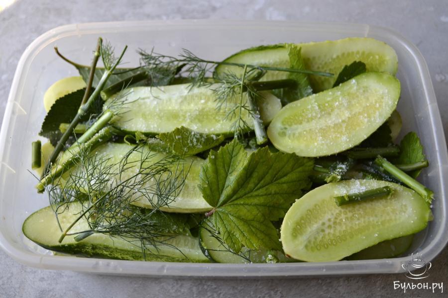 7. И так чередуйте слои огурцов и зелени, пока не заполните контейнер или пока не закончатся огурцы. Слой огурцов посыпайте солью.