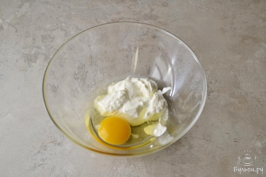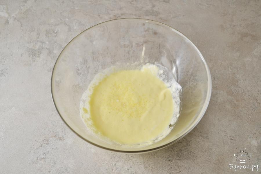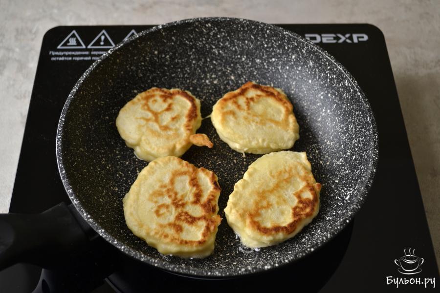 5. Разогрейте сковороду с растительным маслом и ложкой, положите небольшие порции теста. Сделайте огонь минимальным и под крышкой обжаривайте оладушки до румяной корочки.