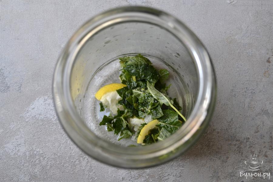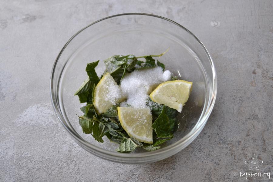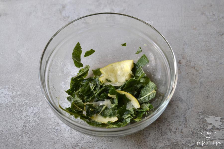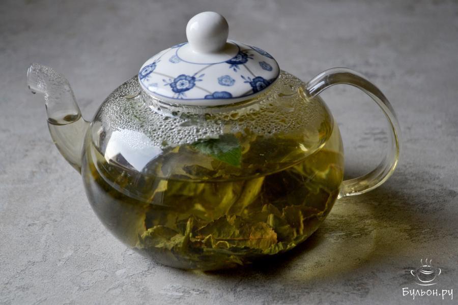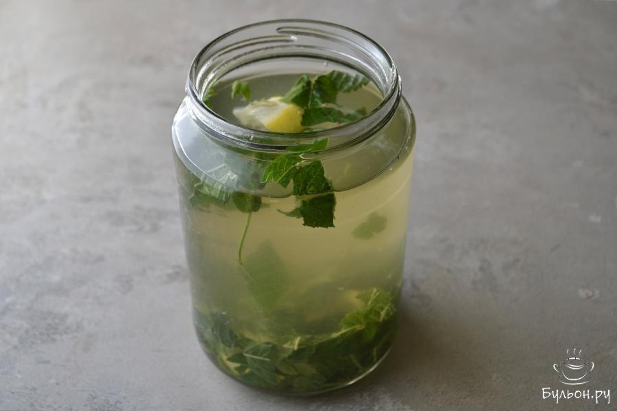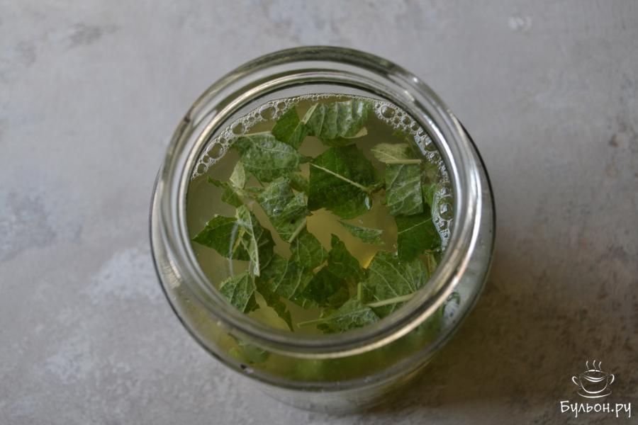 1. Положите в заварочный чайник зеленый чай и листья мяты с одной веточки, залейте горячей водой и оставьте для настаивания.