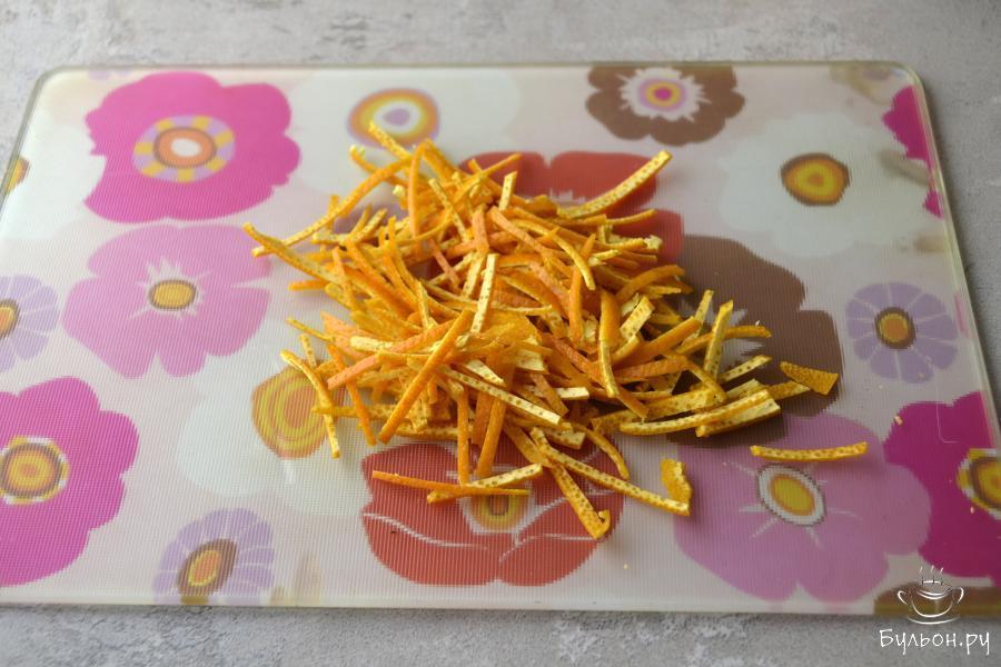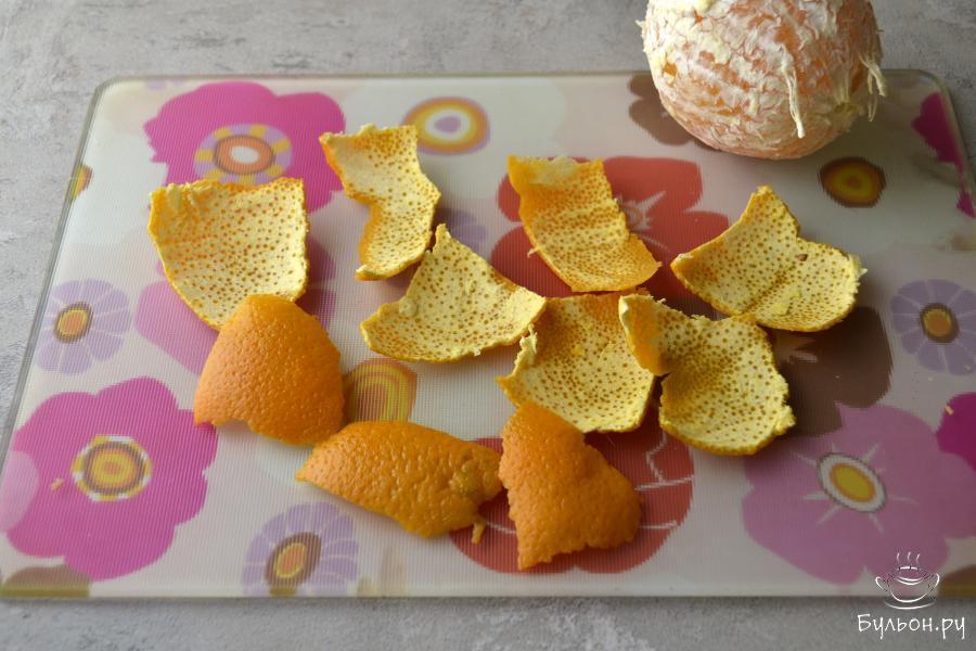 6. Вымойте с содой апельсин, очистите его от кожуры. С кожуры снимите белую часть, для варенья понадобится только верхняя оранжевая кожица.