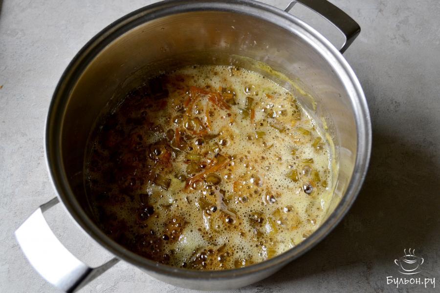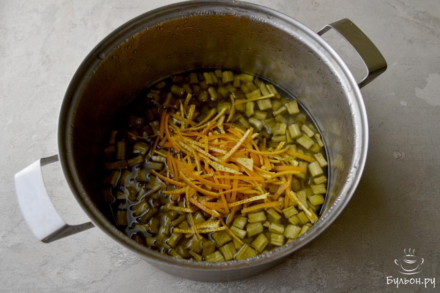 9. На слабом огне, проварите второй раз ревень, с цедрой апельсина, в течение 5-8 минут и снимите с огня для остывания. Во время варки обязательно снимайте пенку.