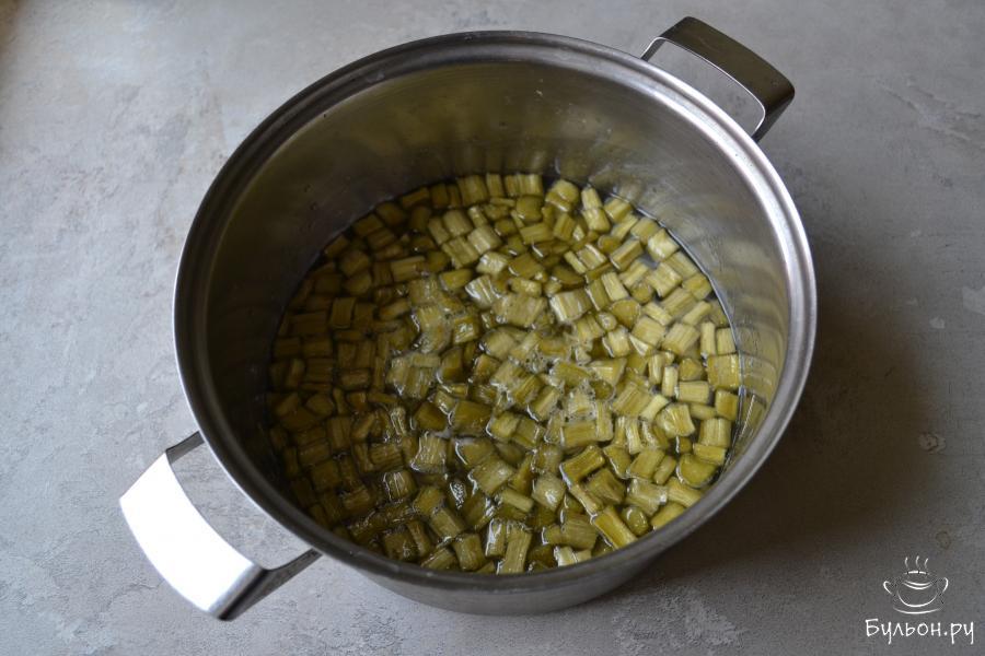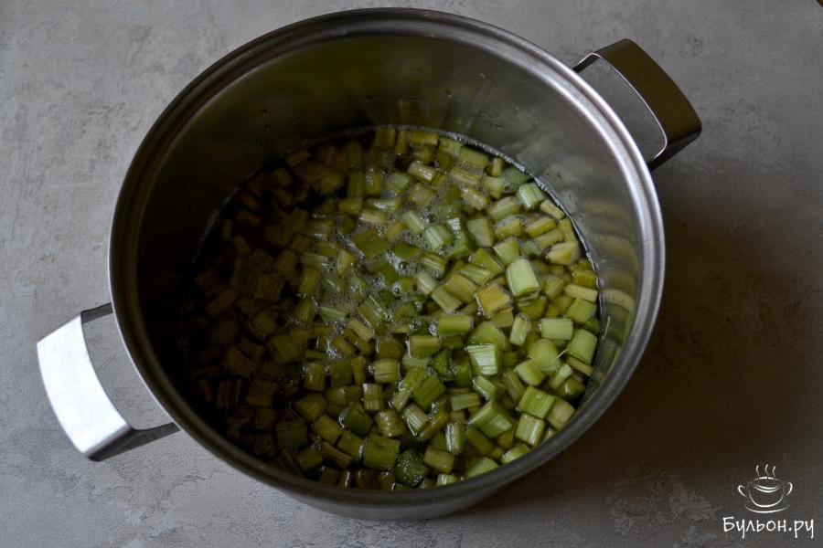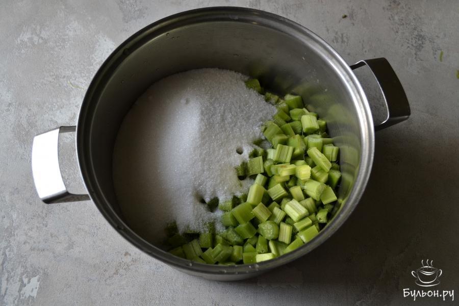 3. Каждый черешок нарежьте на кусочки, длиной около 1 см и сложите в кастрюлю. Засыпьте ревень сахаром и отставьте на несколько часов, чтобы ревень дал сок.