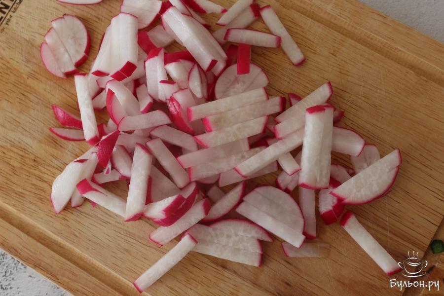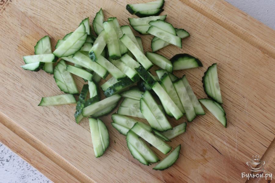 1. С помощью специальной шинковки нарежьте соломкой помытый огурец. Если нет шинковки, просто нарежьте обычным кухонным ножом.