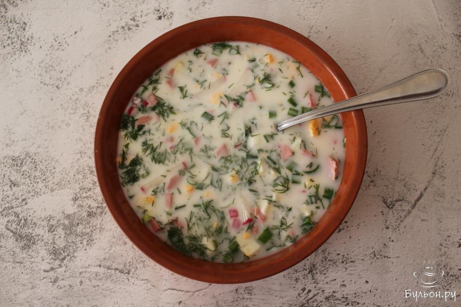 7. Залейте охлажденным кефиром и охлажденной водой, посолите и перемешайте. Сразу же в холодном виде подайте суп к столу.