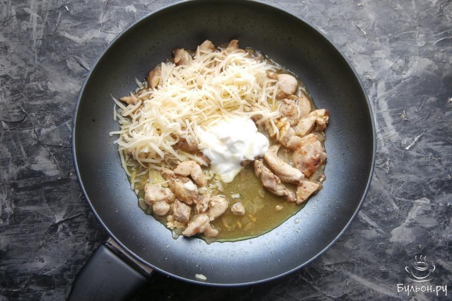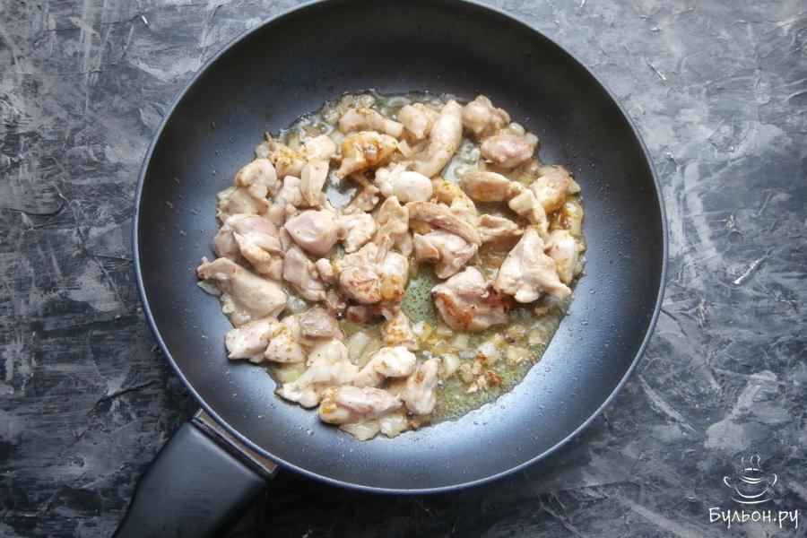 3. Добавить мелко порезанный репчатый лук и обжарить все на среднем огне 7-10 мин. Посыпать курицу приправой и солью.