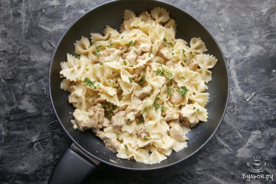 5. Выложить в сковороду отварные фарфалле, все перемешать и прогреть на небольшом огне минуты 3-4. Посыпать блюдо измельченной петрушкой.