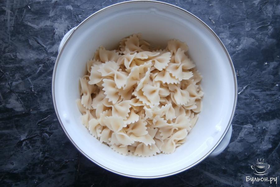 1. Фарфалле должны быть только из твердых сортов пшеницы. Макароны сварить в кипящей воде, подсолив ее, до готовности (см. инструкцию на упаковке), откинуть на дуршлаг, дать стечь воде.