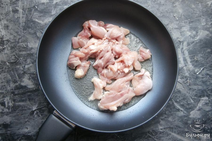 2. Куриное мясо (я использовала обрезь с бедер и окорочков) порезать продолговатыми кусочками, выложить в горячую сковороду с растительным маслом.