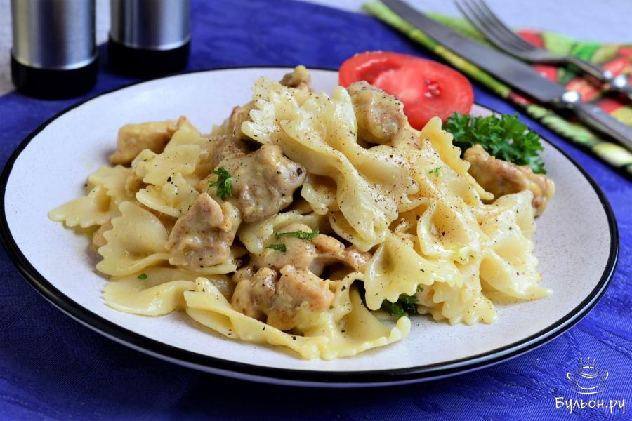 Фарфалле - это вид короткой итальянской пасты из твердых сортов пшеницы в виде бантиков. Эти макароны можно готовить различным способом, я предлагаю попробовать их с курицей. Очень вкусно и сытно получается, это блюдо можно предложить на ужин для своих близких. Куриное мясо можете взять любое: филе или обрезанное с окороков или бедер. Сыр обязательно нужно взять жирных сортов и хорошего качества. Попробуйте обязательно это блюдо - очень вкусно!