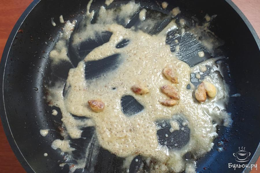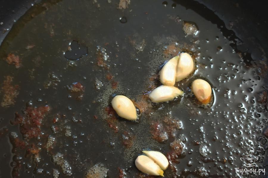 4. Затем бедра вытащить из сковороды. Отправить в ту же сковородку, где жарились бедра, 7 очищенных зубчиков чеснока. Жарить пару минут.