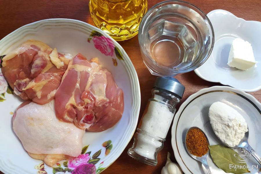 1. Для приготовления блюда, нам понадобятся такие продукты: куриные бедра, чеснок, соль, вода, приправа для курицы, сливочное и растительное масло для жарки, лавровый лист и пшеничная мука.