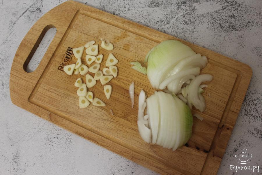 2. На этой же сковороде обжарим лук, нарезанный полукольцами, и зубчики чеснока, нарезанные пластинами.
