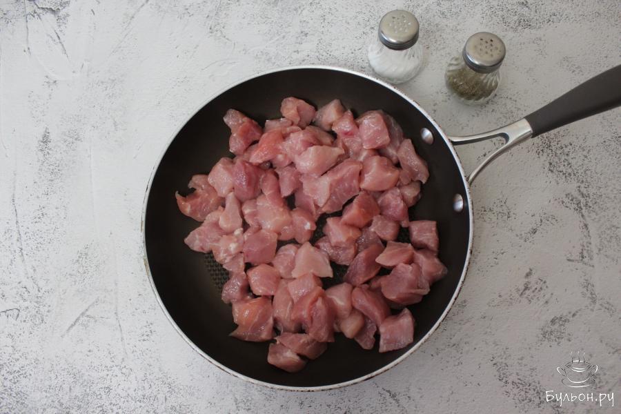 1. Вымытую свинину нарежем кубиками, переложим в сковороду и слегка обжарим на растительном масле, подсолив в конце кусочки свинины. Когда мясо слегка подрумянится, переложим его в чистую миску. Чтобы оно не обветривалось, прикроем миску с мясом тарелкой.