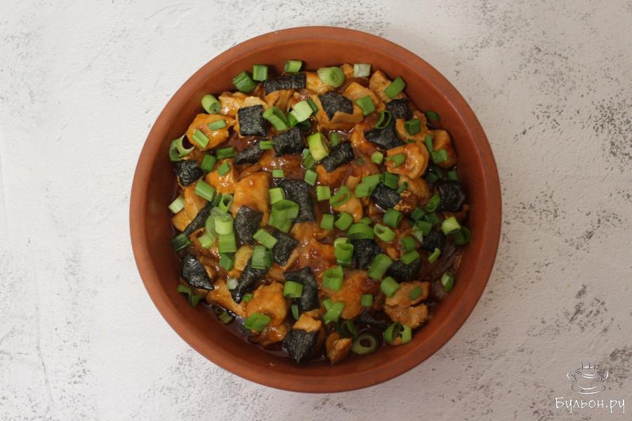 6. Тушеную свинину в томатном соусе выложим на тарелку, сверху посыпем зеленым луком и квадратиками нори.