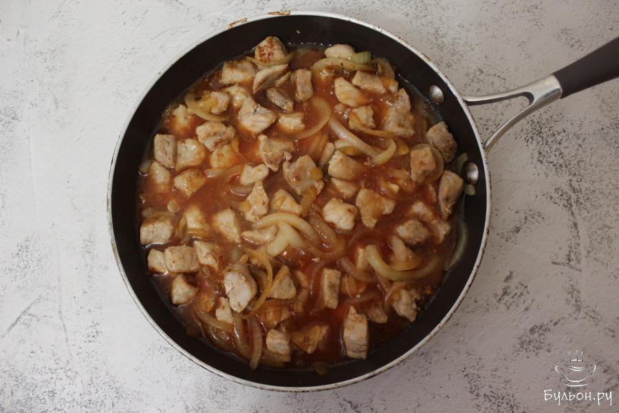 4. К обжаренным овощам выложим теплые кусочки свинины, добавим перец и зальем содержимое сковороды приготовленным томатным соусом. Закроем крышку и будем тушить примерно 20-25 минут на среднем огне.