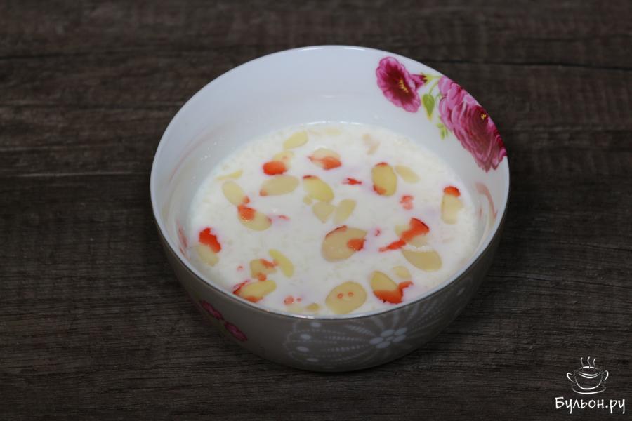 5. Зальем все это молоком и сверху украсим капельками клубничного топпинга. Десерт готов, наслаждайтесь на здоровье!