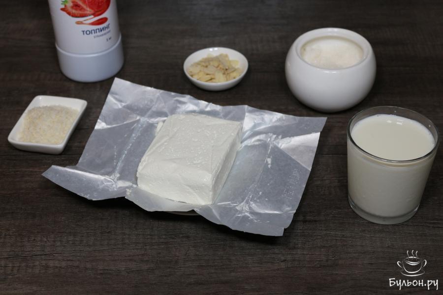 1. Подготовим ингредиенты. Мне нравится этот десерт холодным, поэтому заранее из холодильника продукты не достаю.
