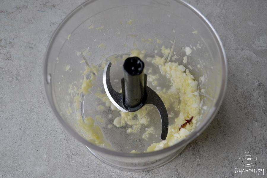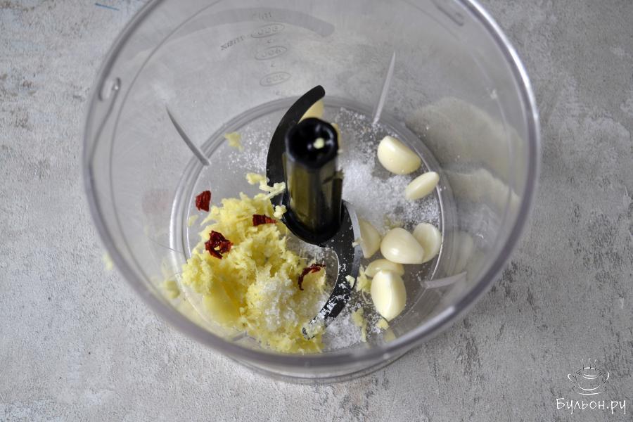 3. Свежий имбирь очистите и натрите на мелкой терке. Очистите зубчики чеснока. В чашу блендера положите чеснок, натертый имбирь, соль, сахар, острый перец чили.