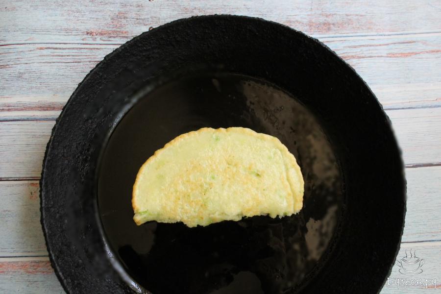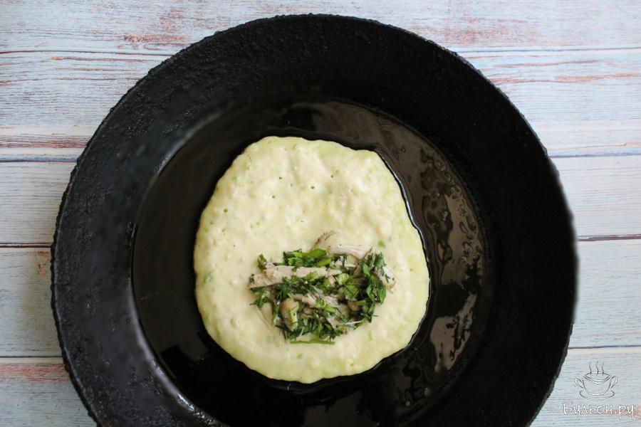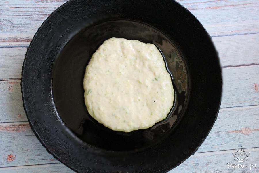 9. Выкладываем половник теста на разогретую сковороду, с небольшим количеством масла. Жарим блин около минуты.